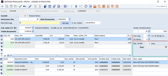 In Gestione prima nota l'utente deve effettuare la registrazione della fattura con la causale precedentemente mappata indicando il conto dell'anagrafica clienti caricato per la ditta.