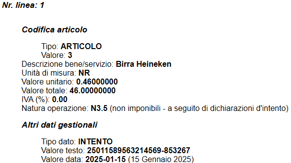 Per i file XML generati correttamente I dati relativi alla dichiarazione di intento saranno esposti come segue: